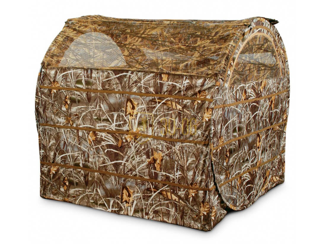 Для оперативной подготовки к выстрелу предусмотрен откидной верх из сетки. Конструкция палатки включает задние и боковые окна, предназначенные для стрельбы. Дополнительную маскировку можно осуществить при помощи местной растительности. Засидка также подходит для охоты на тетерева, утку и голубя. Для удобства транспортировки в комплекте предусмотрен рюкзак.